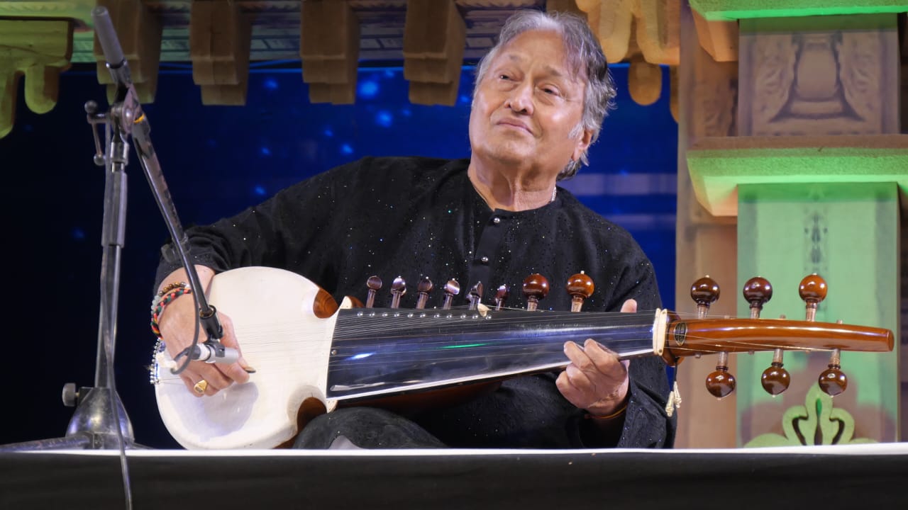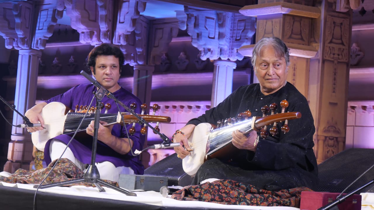 इसके बाद मंच पर आए विश्व विख्यात सरोद वादक उस्ताद अमजद अली खान ने कुछ भावपूर्ण धुनें प्रस्तुत कीं। महात्मा गांधी के प्रिय भजन “वैष्णव जन तो तेने रे कहिए” की सरोद पर सजी धुन ने श्रोताओं को भावविभोर कर दिया। इसके पश्चात “रघुपति राघव राजाराम” और “वंदे मातरम्” की मधुर प्रस्तुति ने वातावरण को देशभक्ति और अध्यात्म से भर दिया। उस्ताद अमजद अली खान की वादन शैली की विशेषता—स्वर की स्पष्टता, कोमलता और संतुलित मींड–गमक—हर धुन में स्पष्ट झलकी।