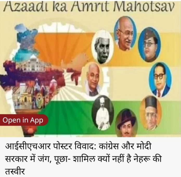 भारतीय इतिहास अनुसंधान परिषद (आईसीएचआर) द्वारा जारी ‘आजादी का अमृत महोत्सव’ के पोस्टर पर विवाद खड़ा हो गया. पोस्टर पर नेहरू की तस्वीर न होने को लेकर कई कांग्रेस नेताओं ने आपत्ति जताई है.