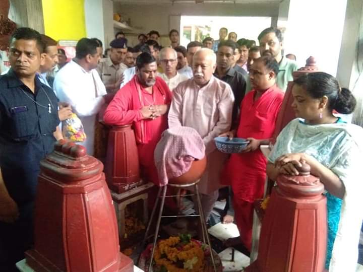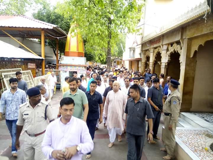 राष्ट्रीय स्वयंसेवक संघ के सरसंघचालक मोहन भागवत आज सुबह  मां पीतांबरा शक्ति पीठ में दर्शन के लिए पहुंचे। श्री भागवत मां धूमावती देवी की आरती में शामिल हुये। वही मंदिर परिसर स्थित मां बगुलादेवी सहित अन्य मंदिरों में उन्होंन पूजा अर्चना की। भागवत करीब एक घंटे से अधिक समय तक मंदिर परिसर में रहे। उसके बाद वे सड़क मार्ग से झांसी के लिए रवाना हो गये। उल्लेखनीय है की झांसी में राष्ट्रीय स्वयंसेवक संघ  एक अखिलभारतीय संगठनात्मक वर्ग चल रहा है,इसमें देशभर के तमाम अपेक्षित  पूर्णकालिक  स्वयंसेवक शामिल हुए हैं। संघ प्रमुख इसी वर्ग में मार्गदर्शन हेतु झाँसी पहुंचे है। यहां आने से पूर्व उन्होंने दतिया के विश्वप्रसिद्ध मां पीताम्बरा के जागृत पीठ में पूजा अर्चना की ।