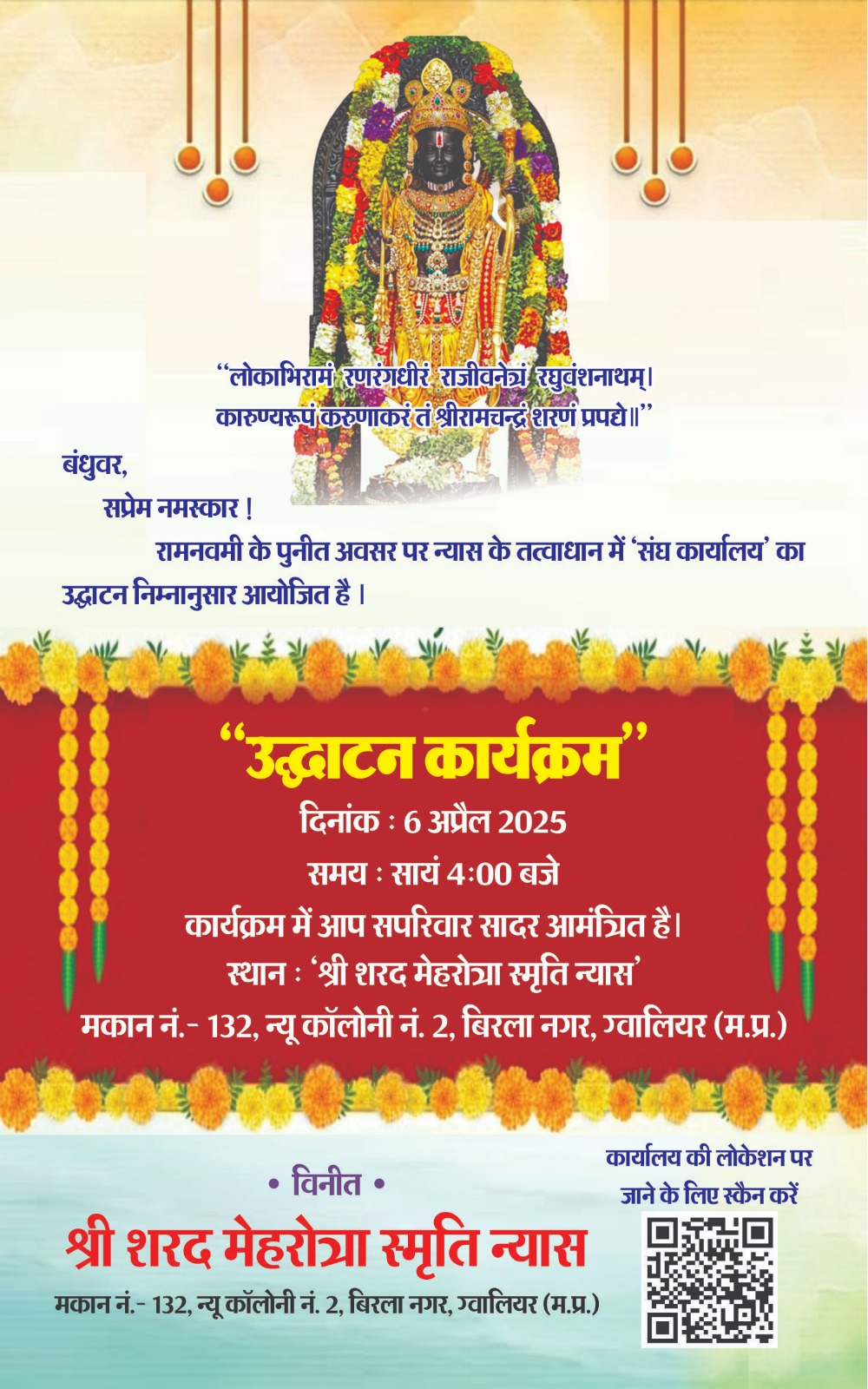ग्वालियर/ शरद स्मृति सेवा न्यास द्वारा बिरलानगर में राष्ट्रीय स्वयंसेवक संघ कार्यालय का उद्घाटन रामनवमी 6 अप्रैल को शाम 4 बजे किया जाएगा।