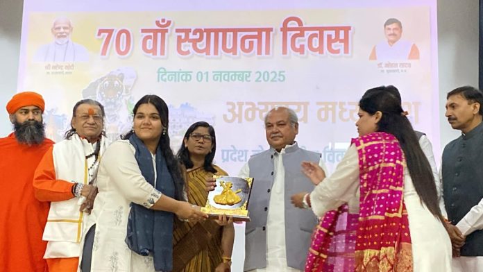 ग्वालियर 1 नवंबर 2025/ग्वालियर मे मध्य प्रदेश के स्थापना दिवस के मुख्य समारोह में अंतरराष्ट्रीय कथक नृत्यांगना डॉल जयेश कुमार के कथक को सम्मानित किया गया।