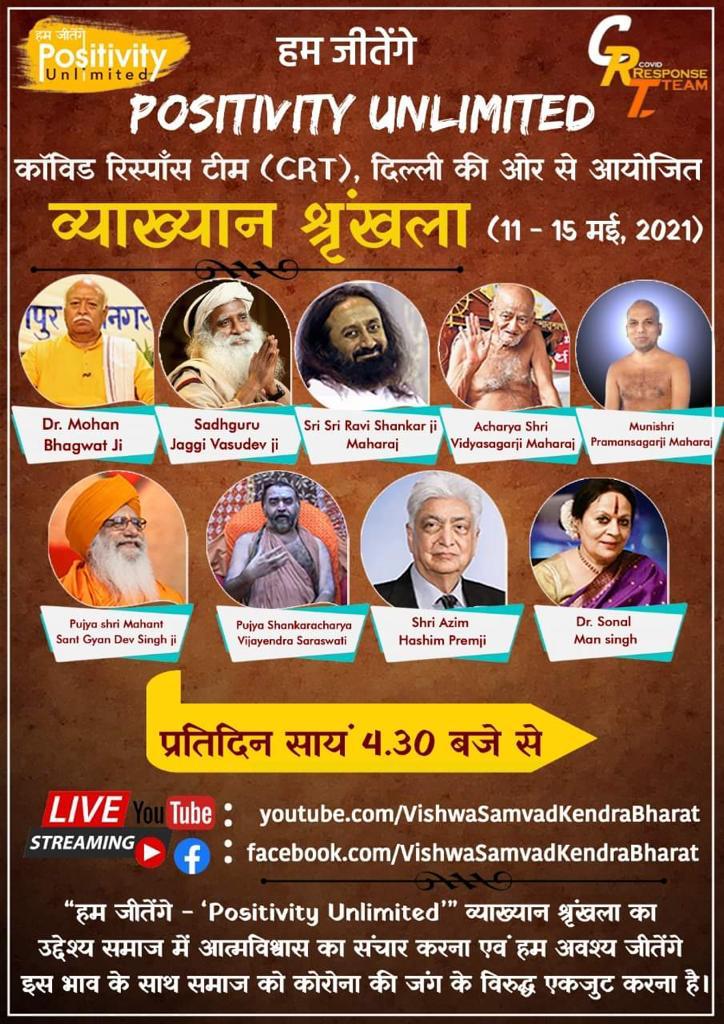 “हम जीतेंगे — ‘Positivity Unlimited’” टैगलाइन के साथ अक्षय तृतीय के उपलक्ष्य में आयोजित ऑनलाइन श्रृंखला में प्रत्येक दिन 30 मिनट से अधिक समय तक, आध्यात्मिकता, धार्मिक चर्चा, मानसिक स्वास्थ्य से लेकर जीवन को मजबूत बनाने जैसे विभिन्न पहलुओं को श्रेष्ठ वक्ताओं द्वारा प्रस्तुत किया जाएगा।