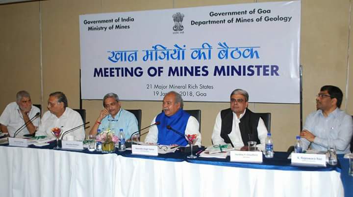 केंद्रीय खान मंत्री श्री नरेन्द्र सिंह तोमर, गोवा के मुख्यमंत्री श्री मनोहर परिक्कर और खनिज संपदा सम्पन्न प्रमुख राज्यों के खनन विभाग के प्रभारी मंत्रियों की अध्यक्षता में एक बैठक आज गोवा में हुई। केंद्रीय खान राज्य मंत्री श्री हरिभाई पर्थीभाई चौधरी ने मंत्रियों और अधिकारियों का स्वागत करते हुए खनिज क्षेत्र के विकास को प्रोत्साहन देने में केंद्र और राज्यों की सरकार के प्रयासों की चर्चा की। उन्होंने आपस में एक दूसरे से और सम्बद्ध विभागों की श्रेष्ठ प्रक्रियाओं को अपनाने पर जोर दिया।