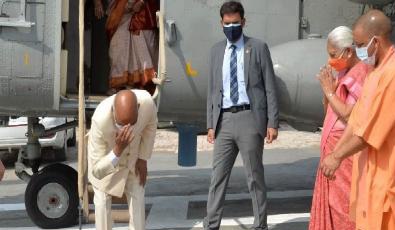 देश के राष्ट्रपति रामनाथ कोविंद तीन दिवसीय दौरे पर उत्तर प्रदेश पहुंचे हैं। तय कार्यक्रम के अनुसार महामहिम रविवार सुबह सबसे पहले अपने गांव परौंख पहुंचे। यहां उन्होंने पथरी देवी मंदिर में दर्शन किए और फिर गांव वालों का अभिनंदन करते हुए सभी को धन्यवाद दिया। इसके बाद राष्ट्रपति ने अपनी मातृभूमि को झुककर नमन किया और उसकी मिट्टी को माथे पर लगाया। राष्ट्रपति के साथ यूपी के मुख्यमंत्री योगी आदित्यनाथ के अलावा राज्यपाल आनंदीबेन पटेल भी मौजूद रहीं।