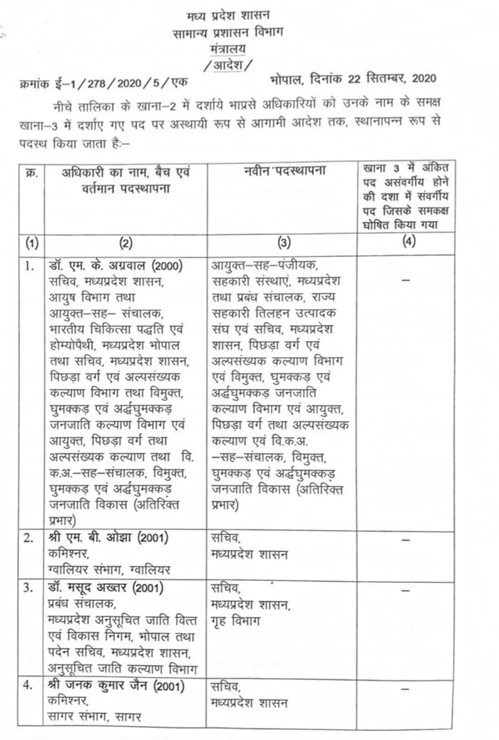 ग्‍वालियर के कमिश्‍नर एमबी ओझा काे सचिव बनाया गया है। डॉ एमके अग्रवाल को आयुक्‍त सह पंजीयक सहकारी संस्‍थाएं नियुक्‍त किया गया है।