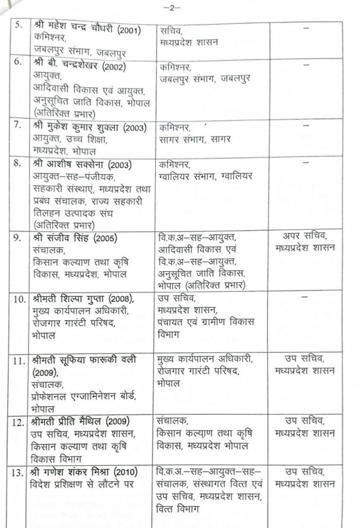 इसके साथ ही उन्‍हें अन्‍य दायित्‍व भी सौंपा गया है। सागर के कमिश्‍नर जनक कुमार जैन को भी मंत्रालय में सचिव नियुक्‍त किया गया है। जबलपुर संभाग के कमिश्‍नर महेश चंद्र चौधरी को भी मंत्रालय में सचिव बनाया गया है। बी चंद्रशेखर जबलपुर और मुकेश कुमार शुक्‍ला सागर के कमिश्‍नर बनाए गए हैं जबकि आशीष सक्‍सेना ग्‍वालियर के कमिश्‍नर होंगे।