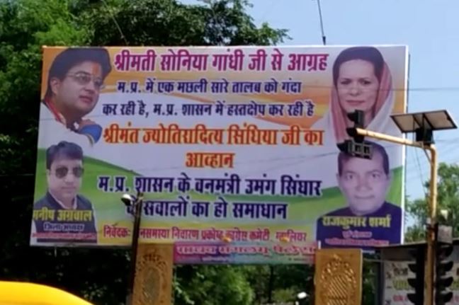 मध्यप्रदेश में इस समय राजनैतिक घमासान मचा हुआ है। इसके केंद्र में हैं पूर्व मुख्यमंत्री दिग्विजय सिंह और पूर्व केन्द्रीय मंत्री ज्योतिरादित्य सिंधिया। सिंधिया समर्थक मंत्री विधायक नेता उन्हें पीसीसी चीफ बनाए जाने के लिए अभियान चला रहे हैं तो दिग्विजय सिंह अपने बयानों से इस आग में घी डालने का काम कर रहे हैं । इससे अलग पिछले दिनों उन्होंने जो चिट्ठी मंत्रियों को जारी कर पोस्टिंग ट्रांसफर का हिसाब मांग लिया उसने भी बवाल मचा दिया। वन मंत्री उमंग सिंघार ने इसकी शिकायत सोनिया गांधी से कर दी। इसी बीच पिछले दिनों ग्वालियर में सिंधिया समर्थक नेताओं ने सोनिया गांधी से अपील की कि वे बिना दबाव में आए सिंधिया जी को पीसीसी चीफ बनाए ।इसके लिए शहर में बैनर लगाए गए। अब एक नया बैनर सामने आया है। जयविलास पैलेस के बाहर लगाए गए इस बैनर में सोनिया गांधी से आग्रह करते हुए लिखा है कि मप्र में एक मछली सारे तालाब को गंदा कर रही है और मप्र शासन में हस्तक्षेप कर रही है। बैनर पर निवेदक के तौर पर जिला कांग्रेस कमेटी के मीडिया प्रभारी और ग्वालियर विकास प्राधिकरण के पूर्व संचालक राजकुमार शर्मा एवं समस्या निवारण प्रकोष्ठ के जिला अध्यक्ष मनीष अग्रवाल का नाम और फोटो है।
