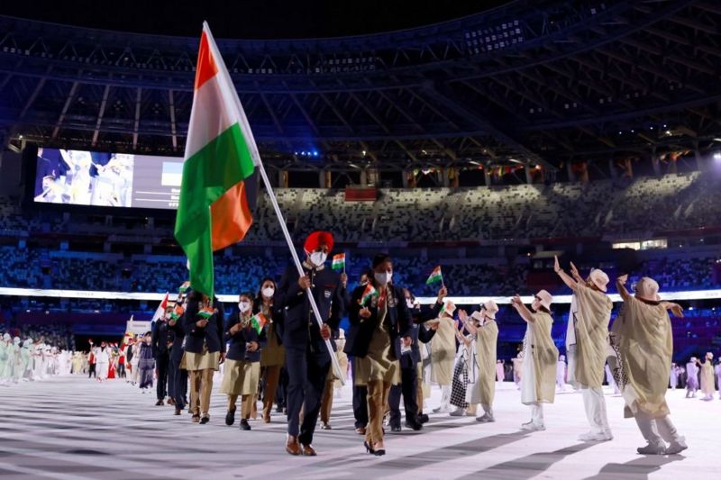 भारत 25वीं बार ओलंपिक खेलों में हिस्सा ले रहा है और इस बार उसने अपना सबसे बड़ा दल उतारा है। ओलंपिक मार्च पास्ट की शुरुआत हमेशा की तरह यूनान से हुई जहां पहले ओलंपिक खेल हुए थे। भारतीय दल जापानी वर्णमाला के अनुसार 21वें नंबर पर आया। पुरुष हॉकी टीम के कप्तान मनप्रीत सिंह और छह बार की वर्ल्ड चैंपियन एमसी मैरीकॉम के हाथों में तिरंगा लहरा रहा था और उनके साथ भारत के अन्य खिलाड़ियों और छह अधिकारियों के चेहरे पर मुस्कान और जोश दिख रहा था। भारत के 127 खिलाड़ियों सहित 228 सदस्यीय दल ओलंपिक में भाग ले रहा है लेकिन इनमें से केवल 20 खिलाड़ियों को उद्घाटन समारोह में भाग लिया। जब उद्घाटन समारोह चल रहा था उस समय भी स्टेडियम के बाहर प्रदर्शनकारी ओलंपिक आयोजन के खिलाफ नारेबाजी कर रहे थे। पुलिस को उन्हें हटाने के लिए कार्रवाई करनी पड़ी।