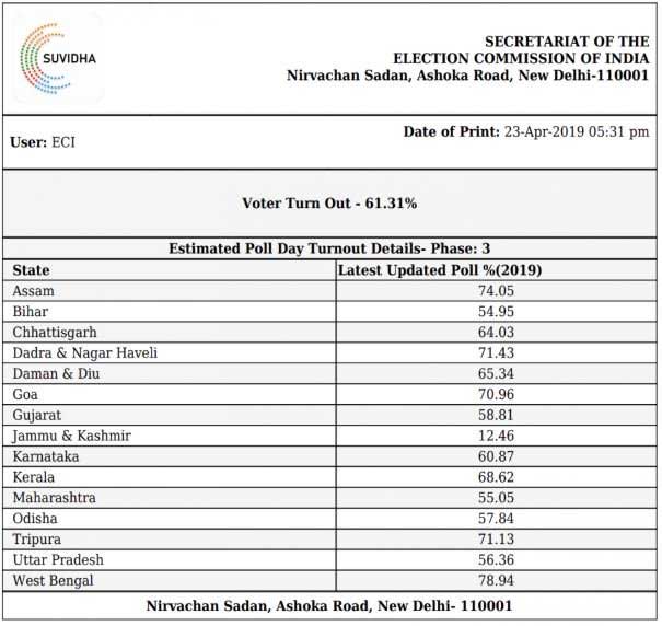 दिल्ली.लोकसभा चुनाव के तीसरे चरण के लिए 15 राज्यों की 117 सीटों पर शाम5बजे तक औसत 61.5% मतदान हुआ । लोकसभा चुनाव के तीसरे चरण में 15 राज्यों की 117 सीटों पर आज वोट डाले गए हैं। लोकसभा चुनाव 2019 के तीसरे चरण में शाम 5 बजे तक 61.31 फीसद मतदान हो चुका है। पश्चिम बंगाल में बंपर वोटिंग हुई है। शाम 5 बजे तक पश्चिम बंगाल में 78.94 प्रतिशत वोट पड़े । वहीं, असम में शाम 5 बजे तक 74 फीसद से ज्यादा वोटिंग हो हुई है। आज तीसरे चरण में गुजरात की 26, केरल की 20, महाराष्ट्र की 14, कर्नाटक की 14, उत्तर प्रदेश की 10, छत्तीसगढ़ की 7, ओडिशा की 6, बिहार की 5, पश्चिम बंगाल की 5, असम की 4, गोवा की 2, जम्मू-कश्मीर, दादर नागर हवेली, दमन दीव और त्रिपुरा की 1-1 सीट पर मतदान हुआ है।