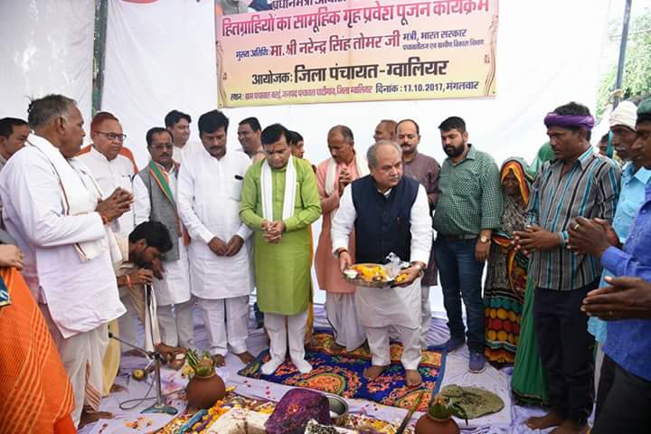 विकासखण्ड घाटीगाँव के ग्राम बरई में प्रधानमंत्री अवास योजना के तहत धनतेरस पर श्री तोमर के मुख्य आतिथ्य में सामूहिक गृह प्रवेश कार्यक्रम आयोजित किया गया। जिले की अन्य ग्राम पंचायतों में आयोजित हुए सामूहिक गृह प्रवेश कार्यक्रमों में मौजूद हितग्राहियों से केन्द्रीय मंत्री ने बरई वीडियो कॉन्फ्रेंसिंग के जरिए सीधा संवाद किया। श्री तोमर ने यज्ञ मण्डप में बरई के सभी 25 दम्पत्ति (हितग्राही) के साथ विधि-विधान से पूजा-अर्चना की और नए घरों में मंगल कलश स्थापित कर हितग्राहियों को गृह प्रवेश कराया। केन्द्रीय मंत्री श्री तोमर जब गब्बर व मांगी आदिवासी को गृह प्रवेश कराने पहुँचे तो इन दोनों हितग्राहियों की खुशी से आँखें छलक आईं। इस कार्यक्रम के साथ-साथ बरई में जिला स्तरीय लोक कल्याण शिविर भी आयोजित किया गया।