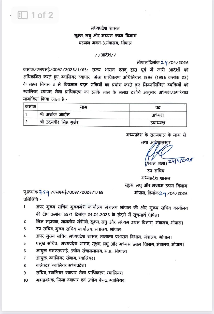 विधानसभा अध्यक्ष नरेन्द्र तोमर के करीबी अशोक जादौन को ग्वालियर मेला प्राधिकरण का अध्यक्ष बनाया गया है। उदयवीर सिंह गुर्जर ग्वालियर मेला प्राधिकरण के उपाध्यक्ष नियुक्त किए गए हैं। उल्लेखनीय है कि लम्बे समय से ग्वालियर मेला प्राधिकरण में नियुक्तियां नहीं की गई थीं इस वजह से इस महत्वपूर्ण प्राधिकरण की कमान प्रशासन के हाथ थी पिछले कई वर्षों से मेले की साख लगातार गिर रही थी इस वर्ष भी मेला ग्वालियर की जनता को आकर्षित करने में नाकाम रहा था और हाटनुमा स्वरुप के साथ समाप्त हो गया अब प्रदेश सरकार द्वारा प्राधिकरण में नियुक्तियां किए जाने के बाद इसके वैभव शाली स्वरुप के लौटने की आशा जागृत हुई है।