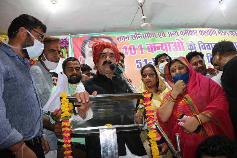 गृह मंत्री डॉ. नरोत्तम मिश्र शनिवार को वृन्दावन धाम में जनपद पंचायत दतिया द्वारा भवन संनिर्माण एवं अन्य कर्मकार मंडल की कन्यादान योजना के तहत 101 कन्याओं को विवाह सहायता के रूप में कुल 51 लाख 51 हजार रूपये की राशि के वितरण समारोह को संबोघित कर रहे है। उन्होंने कहा कि कन्यादान योजना के तहत् कन्याओं को सहायता प्रदाय कर हमनें कोई एहसान नहीं किया है बल्कि सरकार ने अपना फर्ज निभाया है।