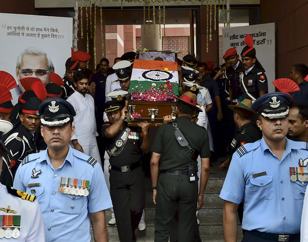 - वाजपेयी के पार्थिव शरीर को फूलों से सजे एक वाहन पर रखा गया था और वाहन पर रंग बिरंगी बड़ी छतरियां लगाई गई थी। इस मौके पर तीनों थल सेना, वायु सेना और नौसेना सेना के दस्ते मौजूद थे।