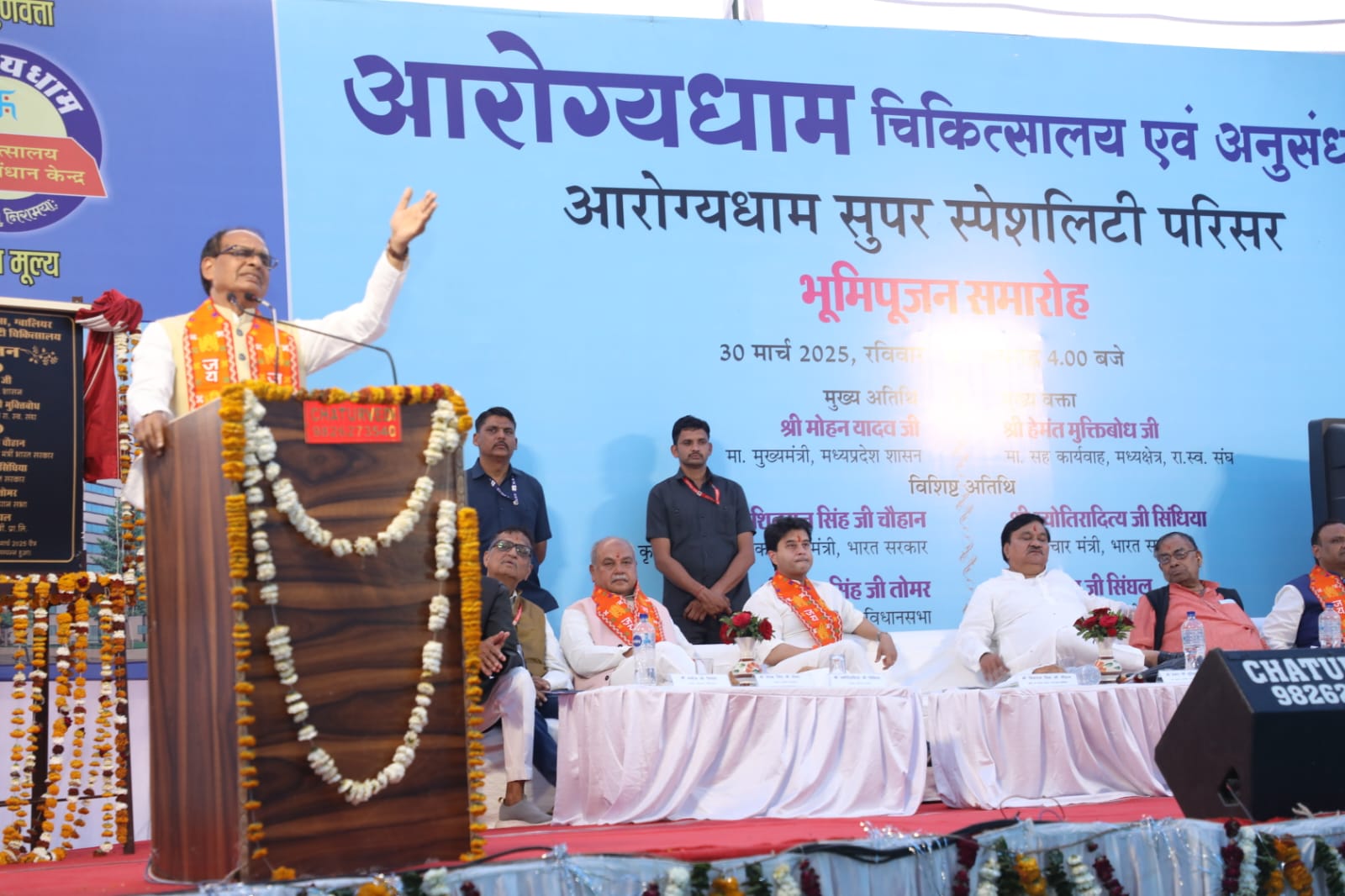 ग्वालियर / तराणेकर स्मृति सेवा न्यास द्वारा  समाज के सहयोग से सिटीसेंटर में संचालित आरोग्यधाम सुपर स्पेशिलिटी अस्पताल के पाँच सौ करोड़ की लागत से बनने जा रहे 500 पलंग के नवीन आरोग्यधाम सुपर स्पेशिलिटी अस्पताल हेतु आज गोला का मंदिर में भव्य भूमिपूजन समारोह सम्पन्न हुआ। इस अवसर पर केन्द्रीय कृषि एवं किसान कल्याण मंत्री श्री शिवराज सिंह चौहान, कार्यक्रम में राष्ट्रीय स्वयंसेवक संघ के मध्य क्षेत्र सह कार्यवाह श्री हेमंत मुक्तिबोध, केन्द्रीय संचार एवं पूर्वोत्तर क्षेत्र विकास मंत्री श्री ज्योतिरादित्य सिंधिया, विधानसभा अध्यक्ष श्री नरेन्द्र सिंह तोमर, दंगल टीवी प्रा.लि. के प्रबंध निदेशक श्री मनीष सिंघल, तराणेकर स्मृति सेवा न्यास के अध्यक्ष श्री राधेश्याम गुप्ता व आरोग्यधाम संचालन समिति के अध्यक्ष श्री मनोज सिंघल मंचासीन थे।