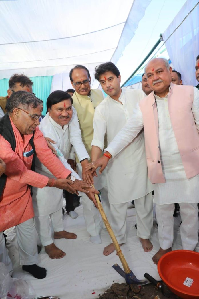आरंभ में केन्द्रीय मंत्री द्वय श्री चौहान व श्री सिंधिया, विधानसभा अध्यक्ष श्री तोमर एवं मुख्य वक्ता श्री मुक्तिबोध सहित अन्य अतिथिगणों ने गेंती फावड़ा से विधि विधान पूर्वक आरोग्यधाम सुपर स्पेशिलिटी चिकित्सालय का भूमिपूजन किया।