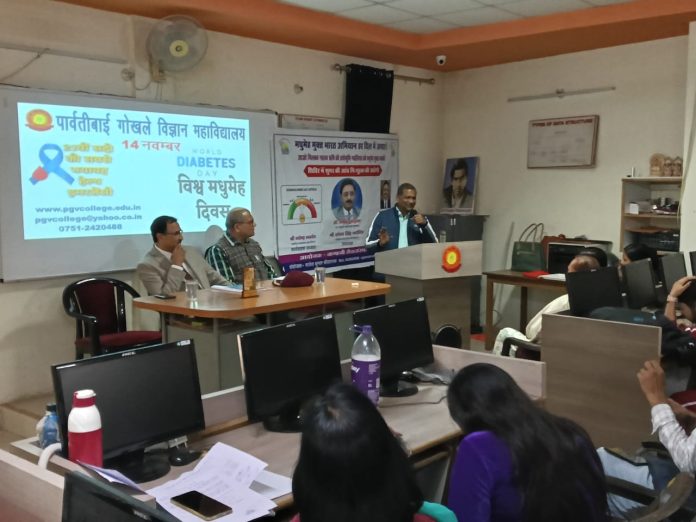 ग्वालियर 12नवंबर 2025/मध्य भारत शिक्षा समिति द्वारा संचालित पार्वती बाई गोखले विज्ञान महाविद्यालय में विश्व मधुमेह दिवस के उपलक्ष्य में एक व्याख्यान कार्यक्रम का आयोजन किया गया ।कार्यक्रम में मुख्य अतिथि के रूप में बाल कल्याण समिति के पूर्व अध्यक्ष एवं वरिष्ठ समाजसेवी डॉक्टर कमल कुमार दीक्षित उपस्थित रहे ।कार्यक्रम की अध्यक्षता गणित विभागाध्यक्ष डॉ कमल कुमार जैन द्वारा की गई।महाविद्यालय के प्राचार्य मेजर डॉ सुनील पाठक भी मंचासीन रहे ।