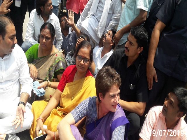 लखनऊ: सोनभद्र हत्याकांड को लेकर उत्तर प्रदेश की सियासत गरमा गई है. सदन से लेकर सड़क तक सोनभद्र हत्याकांड को लेकर शोर सुनाई दे रहा है. इस बीच वाराणसी से सोनभद्र जा रही प्रियंका गांधी को मिर्जापुर में रोका गया तो प्रियंका कार्यकर्ताओं के साथ धरने पर बैठ गईं. कांग्रेस नेता अजय राय ने दावा किया है कि पुलिस ने प्रियंका गांधी को हिरासत में लिया गया है. फिलहाल पुलिस प्रियंका गांधी को मिर्जापुर की तरफ ले जा रही है.