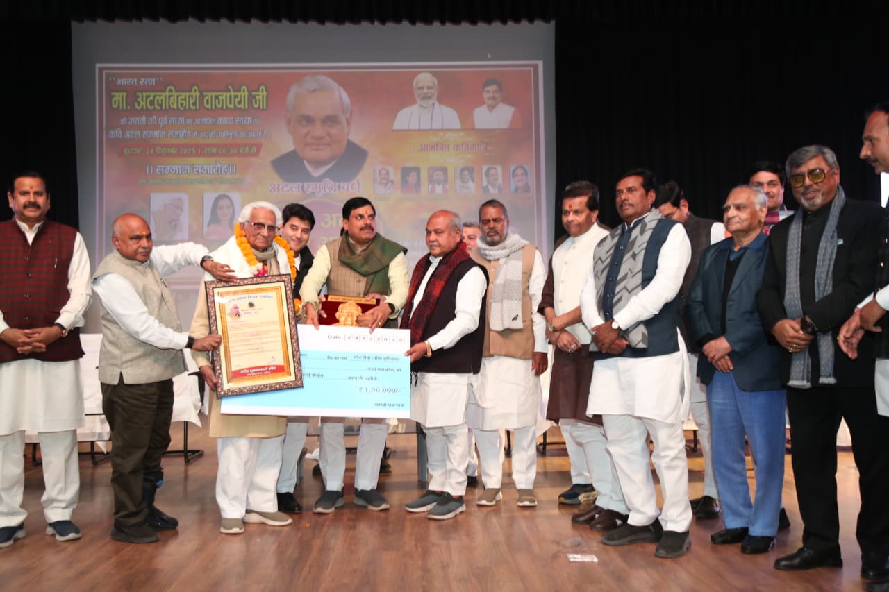 इस अवसर पर उन्होंने देश के प्रख्यात कवि श्री बलवीर सिंह करुण अलवर को वर्ष 2024 एवं प्रख्यात कवियत्री डॉ. कीर्ति काले को वर्ष 2025 के “कवि अटल सम्मान” से विभूषित किया। अटल सम्मान के रूप में दोनों विभूतियों को एक – एक लाख रुपए की राशि, प्रशस्ति पत्र एवं शॉल-श्रीफल सौंपकर सम्मानित किया गया।