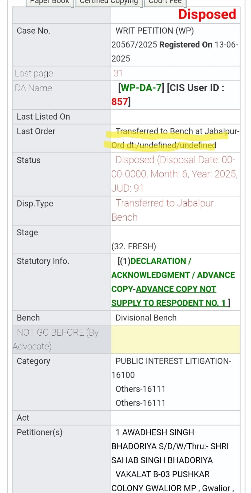 चूंकि उक्त पिटीशन में शासन प्रशासन तथा केंद्रीय एवं प्रदेश सरकार के अलावा मध्य प्रदेश हाई कोर्ट जबलपुर को रजिस्टार जनरल के माध्यम से तथा मध्य प्रदेश हाई कोर्ट खंडपीठ ग्वालियर को प्रिंसिपल रजिस्टर के माध्यम से भी पक्षकार बनाया गया है इसलिए मामले की सुनवाई के लिए उक्त पिटीशन को हाई कोर्ट बेंच ग्वालियर से मुख्य बेंच जबलपुर को ट्रांसफर कर दिया गया है
