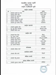 भारतीय जनता पार्टी  द्वारा आज महिला मोर्चा राष्ट्रीय पदाधिकारियों की सूची जारी कर दी गई। इस सूची में 7 उपाध्यक्ष,3महामंत्री ,7 मंत्री,1कोषाध्यक्ष,1 कार्यालय प्रभारी,1 मीडिया प्रभारी और 1सोशल मीडिया प्रभारी बनाया गया । मध्यप्रदेश  की बात करें तोो विदिशा की प्रमुख मध्य प्रदेश की नेत्री पूर्व विधायक स्वर्गीय गुरचरण सिंह की पुत्री को  राष्ट्रीय महासचिव बनाया गया है। ।