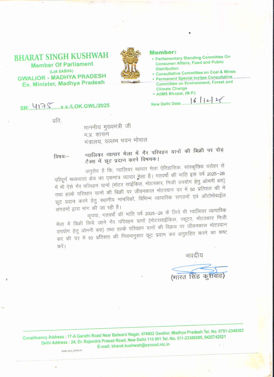 लेकिन घटनाक्रम के तुरंत बाद ही इसी विषय को लेकर ग्वालियर सांसद भारत सिंह से जुड़ा एक समाचार मीडिया प्लेटफार्म पर ट्रेंड करने लगा इसमें बताया गया कि भारत सिंह कुशवाह ने ग्वालियर व्यापार मेला में वाहनों की खरीददारी पर रोड टैक्स में 50 फीसदी छूट की मांग करते हुए मुख्यमंत्री डॉ मोहन यादव को पत्र लिखा है। उन्होंने अपने पत्र में लिखा है कि ग्वालियर व्यापार मेला मध्यभारत क्षेत्र का एक मात्र व्यापार मेला है, जिसमें पूर्व के वर्षों मेें वाहनों की खरीददारी पर रोड टैक्स में 50 फीसदी की छूट प्रदान क ी जाती रही है। इसे लेकर ग्वालियर के नागरिक, व्यापारी संगठन एवं ऑटोमोबाइल संगठन लगातार मांग उठा रहे हैं। अत: गतवर्षों की भांति इस वर्ष भी निजी उपयोग के लिए खरीदे जाने वाले वाहनों पर अविलंब रोड टैक्स में 50 फीसदी छूट की अधिसूचना जारी की जाए, जिससे ग्वालियर मेला को गति मिल सके। वाहनों पर रोड टैक्स में छूट मिलने से मेला कारोबार कई गुना बढ़ जाता है, वहीं मेला की रौनक भी बढ़ जाती है।
