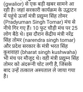 मंच से नीचे गिरे ऊर्जा मंत्री तोमर
