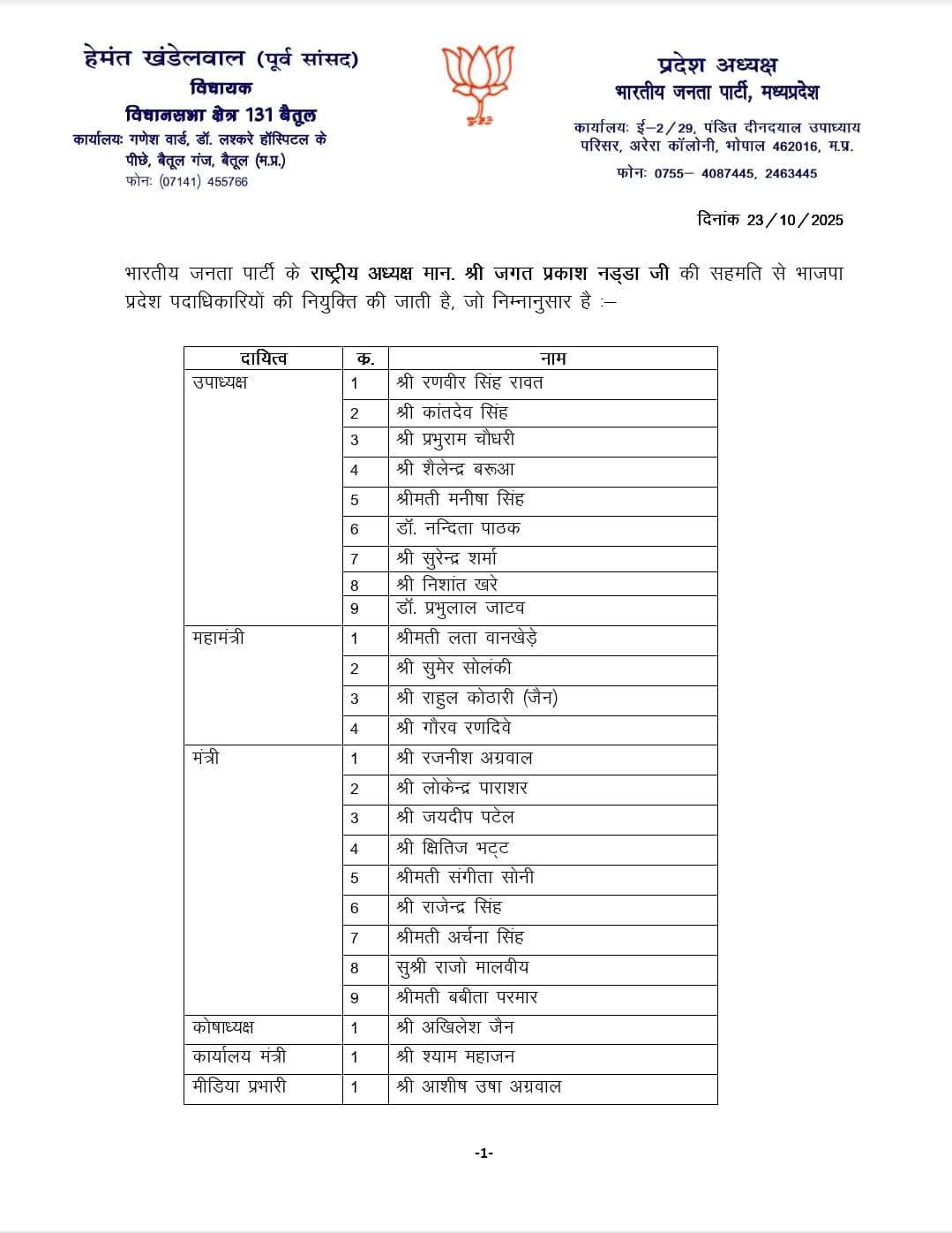भोपाल /ग्वालियर /मध्यप्रदेश बीजेपी प्रदेशाध्यक्ष हेमंत खंडेलवाल ने अपनी नई टीम का ऐलान कर दिया है। गुरुवार को भाजपा केंद्रीय मुख्यालय से सूची जारी की गई है। टीम हेमंत में लता वानखेड़े, सुमेर सोलंकी, गौरव रणदिवे और राहुल कोठारी को प्रदेश महामंत्री बनाया गया है। ग्वालियर की बात करें तो यहां से एक बार फिर मौजूदा मीडिया प्रभारी आशीष अग्रवाल को दोबारा मौका दिया गया है। अग्रवाल को विधानसभा चुनाव से पहले लोकेंद्र पाराशर को हटाकर जिम्मेदारी सौंपी गई थी। वहीं लोकेन्द्र पाराशर कोभी एक बार पुनः मंत्री पद दिया गया है