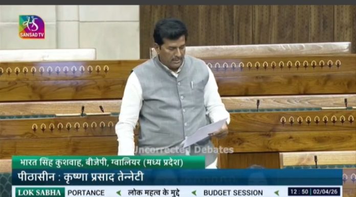 ग्वालियर 2 अप्रैल 2026/ ग्वालियर के सांसद भारत सिंह कुशवाह ने लोकसभा में ग्वालियर रेलवे स्टेशन के पुनर्निर्माण कार्य में हो रही देरी देरी का मुद्दा उठाया है।