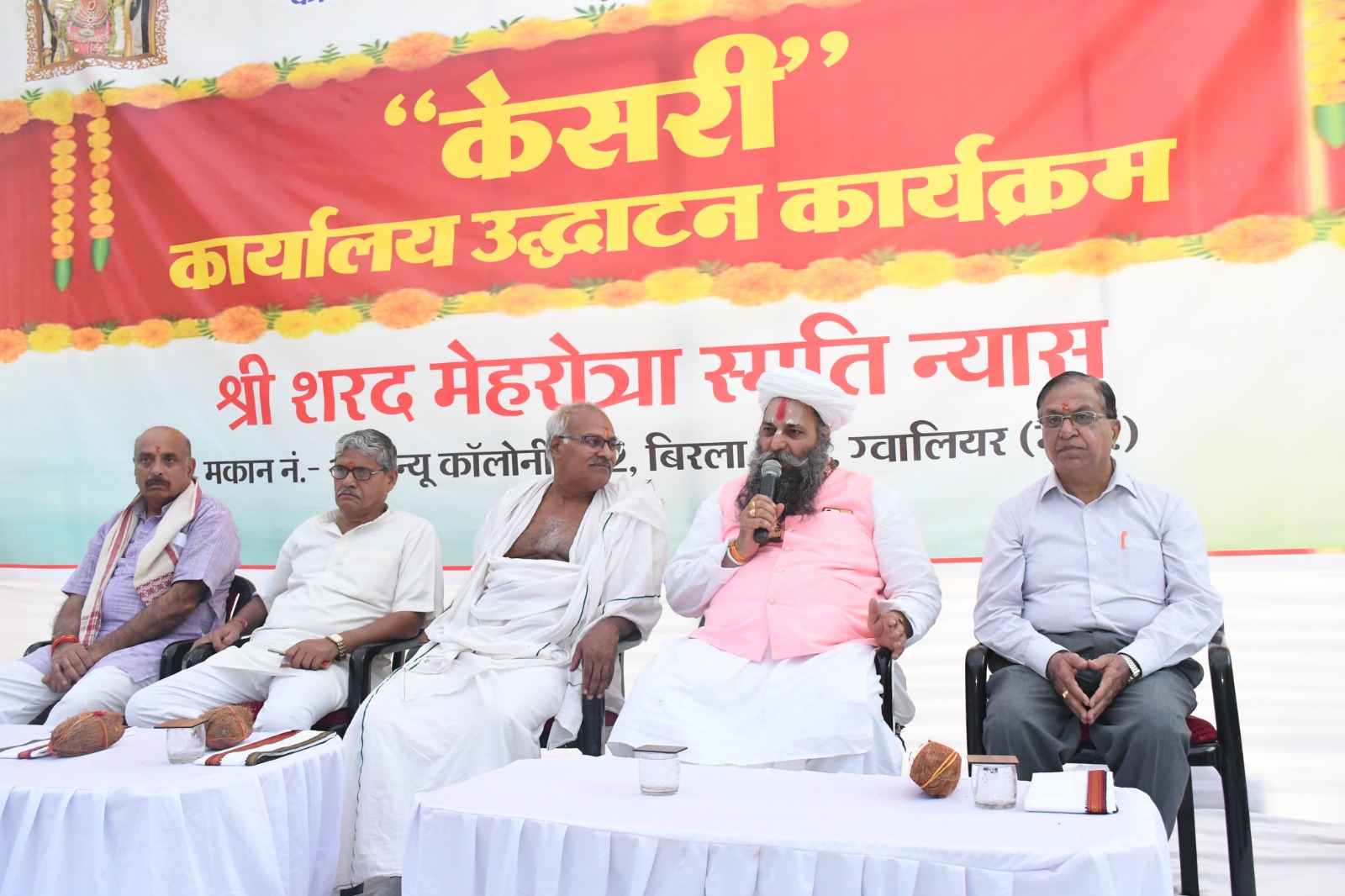 जड़ेरुआ सरकार ने भी आशीर्वाद देते हुए समाज के हित में सतत काम करने की अपील की। कार्यक्रम के प्रारंभ में अतिथि परिचय राष्ट्रीय स्वयंसेवक संघ के सह विभाग कार्यवाह मुनेंद्र सिंह कुशवाह ने दिया। अतिथियों का स्वागत राजेंद घुरैया, प्रभात पटेरिया, राजेश गुप्ता, ओमप्रकाश कुशवाह ने किया। न्यास के अध्यक्ष श्री घुरैया ने न्यास के उद्देश्य पर प्रकाश डालते हुए कहा कि केसरी कार्यालय में चिकित्सालय, विद्यालय सहित समाजोत्थान के लिए कार्य किए जाएंगे। इस अवसर पर पूर्व प्रचारक विजय सिंह राठौर, जितेंद्र भदौरिया आदि ने बाबा के व्यक्तित्व पर विस्तार से प्रकाश डाला।